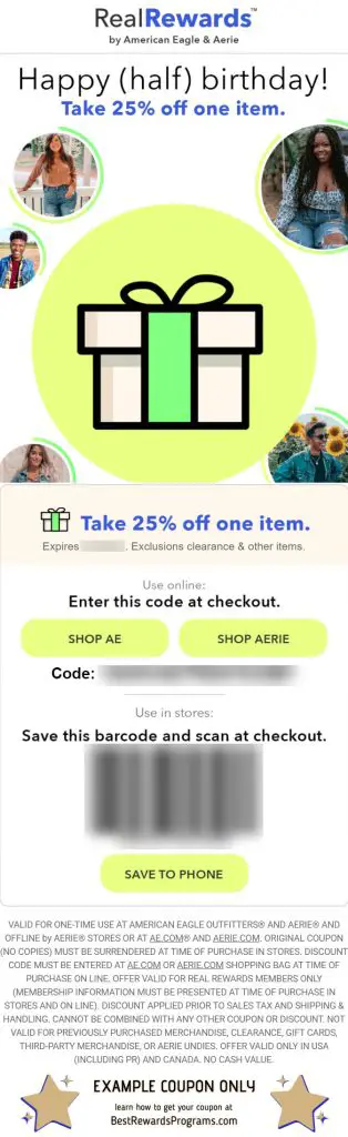 For example, Victoria’s Secret, Aerie’s sister brand, offers a birthday gift to members of their rewards program, but you must make a purchase in the year leading up to your birthday to qualify.
